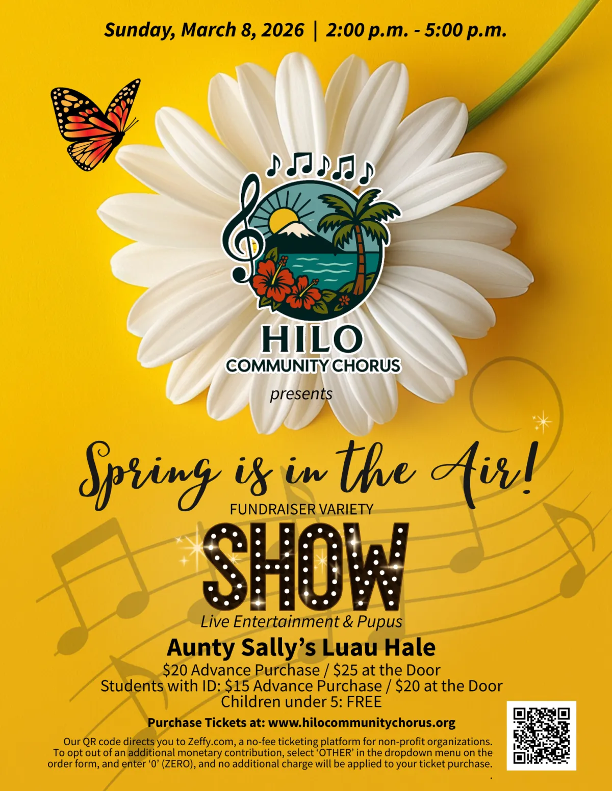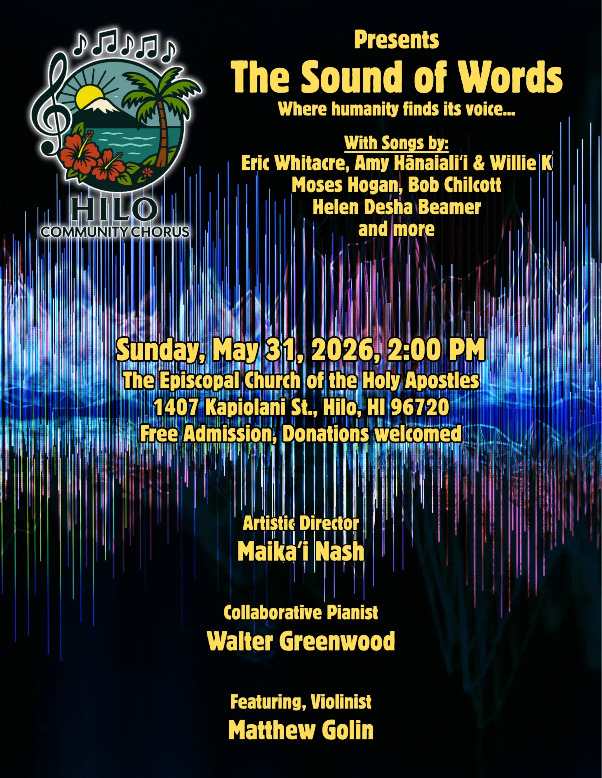 Hilo Community Chorus is a vibrant, non-auditioned choral group on the island of Hawaiʻi, dedicated to honoring its rich diversity through the power of music. Singers of all ages, cultural backgrounds, and musical ability are invited to cultivate the harmonious mix of voices that embody the unique spirit of Hawaii.